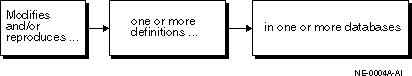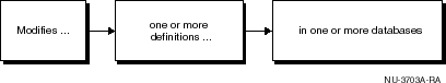 Modifies one or more definitions in one or more databases.