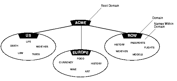 Multiple domains are related hierarchically to a root domain (the highest-level domain in the hierarchy) in a series of parent-child relationships. For example, under the root might be several domains, one of which is called COM. Under the COM domain might be several more domains, one of which is ACME. Under the ACME domain might be several domains, such as US, EUROPE, and so forth.