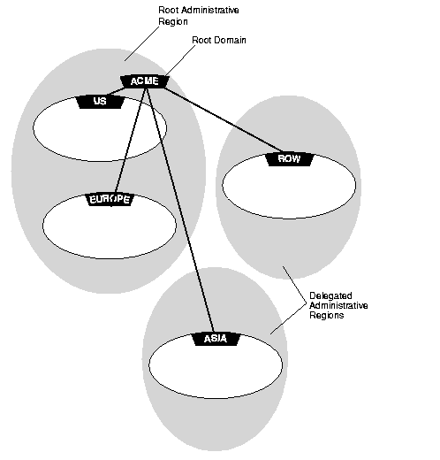 Figure 4-6 depicts a network with five domains and three administrative regions: the root, ACME, and two delegated regions (ROW, ASIA).