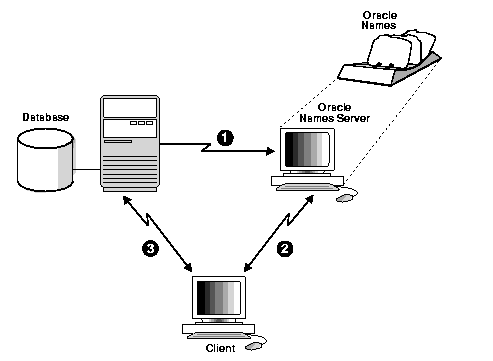 Much like a caller who uses directory assistance to locate a telephone number, clients configured to use Oracle Names refer their connection requests to an Oracle Names server. The Oracle Names server attempts to resolve the service name provided by the client to a network address. If the Oracle Names server finds the network address, it then returns that information to the client. The client can then use that address to connect to the service.