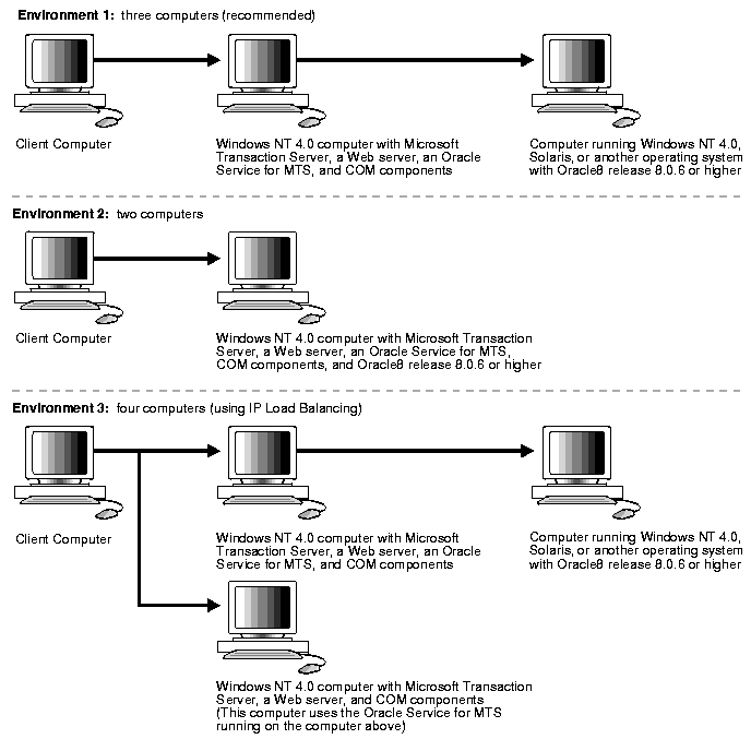 This figure shows three possible installation layouts for your Microsoft Transaction Server and Oracle8 database environment: