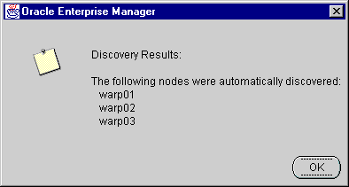 Note: An unsuccessful discovery is usually the result of the Oracle Intelligent Agent not being started on the node. See "Resolving Service Discovery Failures". |