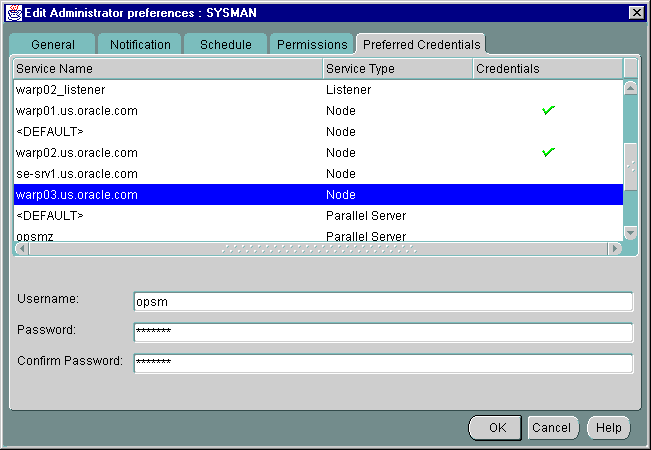 The credentials you configure must identify a valid DBA user with SYSDBA or SYSOPER privileges for the Oracle Parallel Server database on the target node. This enables you to expand the Oracle Parallel Server database folder in the Navigator window and to perform connection and job execution operations. If you do not identify a valid database user, Oracle Enterprise Manager prompts you for this information each time you attempt to connect to the database.