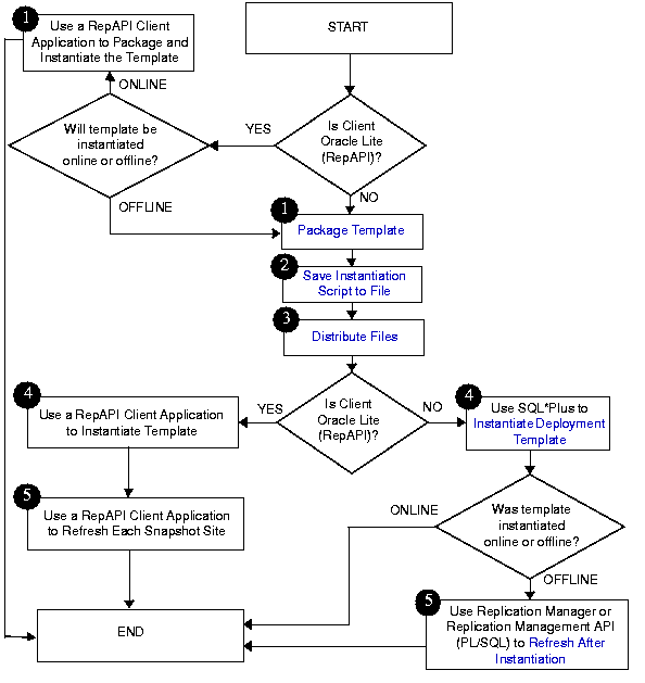 See Also: Some of the tasks in Figure 4-2 instruct you to use a RepAPI client application to package and/or instantiate a deployment template for an Oracle8i Lite snapshot site. To complete these tasks, use a client application such as the Oracle Client Replication Tool, which is supplied with Oracle8i Lite. See your Oracle8i Lite documentation for more information. Also, see Appendix C, "Configuring the Oracle8i Server for RepAPI" in Oracle8i Replication for instructions on configuring your server to support Java RepAPI clients. |
