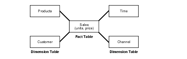 The star schema is the simplest data warehouse schema. It is called a star schema because the diagram of a star schema resembles a star, with points radiating from a center. The center of the star consists of one or more fact tables and the points of the star are the dimension tables shown in Figure 2-1: