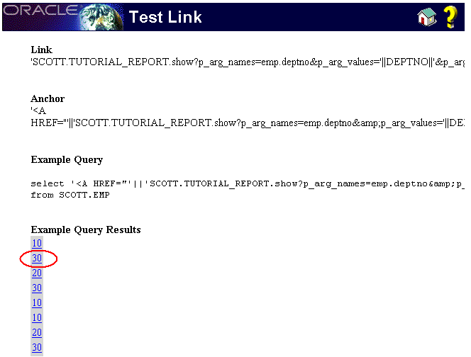- Click 30 to display TUTORIAL_REPORT with the Department parameter set to 30.