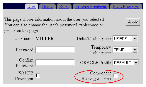 If you add a user to the WEBDB_DEVELOPER roles by checking WebDB Developer on the User Manager: User page, that user is automatically granted Build In privileges on his or her own schema. This is the recommended method for adding a user to the WEBDB_DEVELOPER role.