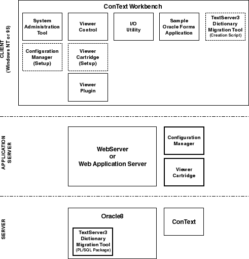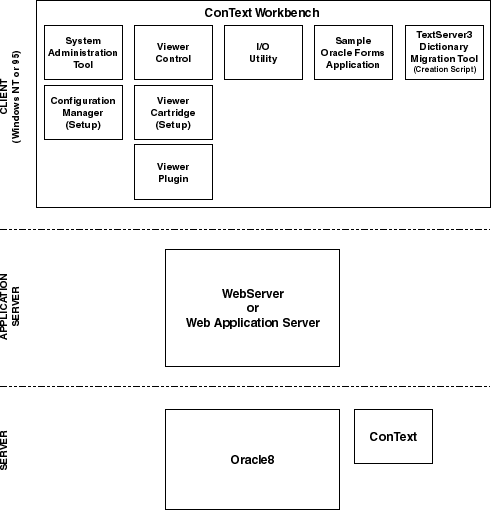 Viewing of documents can be carried out in a client/server environment or in a three-tier environment (via Oracle WebServer or Web Application Server). The ConText Workbench provides separate utilities for use in the two supported environments: