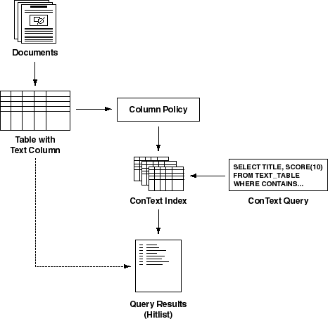 the basic relationships between text tables, policies, ConText indexes,