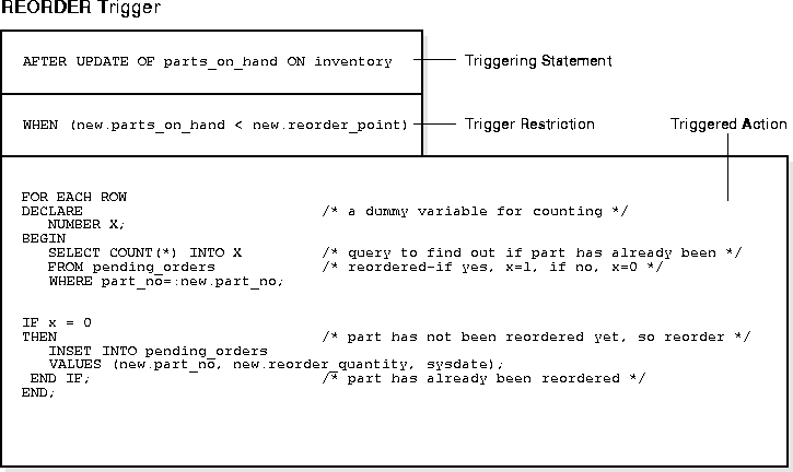 Figure 18-3 represents each of these parts of a trigger and is not meant to show exact syntax. The sections that follow explain each part of a trigger in greater detail.
