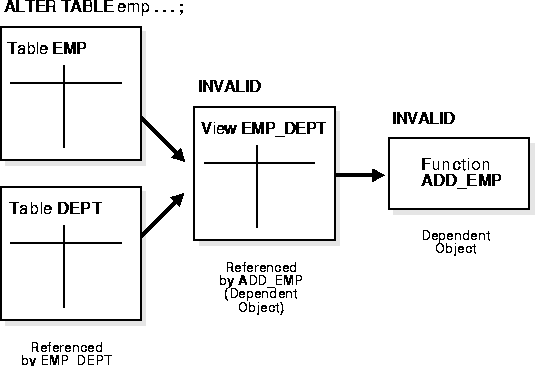 The definitions of some objects, including views and procedures, reference other objects, such as tables. As a result, the objects being defined are dependent on the objects referenced in their definitions. This chapter discusses the dependencies among schema objects and how Oracle automatically tracks and manages these dependencies. It includes: