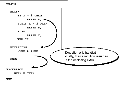 DECLARE past_due EXCEPTION; acct_num NUMBER; BEGIN ... DECLARE ---------- sub-block begins past_due EXCEPTION; -- this declaration prevails acct_num NUMBER; BEGIN ... IF ... THEN RAISE past_due; -- this is not handled END IF; ... END; ------------- sub-block ends EXCEPTION WHEN past_due THEN -- does not handle RAISEd exception ... END;
