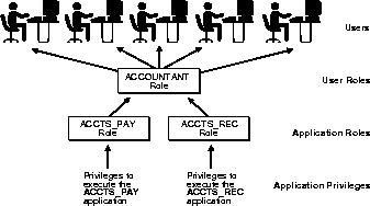 Consider a situation where every user in the accounting department of a company needs the privileges to run the ACCTS_RECEIVABLE and ACCTS_PAYABLE database applications. Roles are associated with both applications, and contain the object privileges necessary to execute those applications.