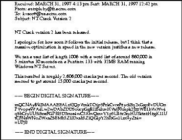 Figure 1-1 shows a typical E-mail message and what the associated digital signature might look like.