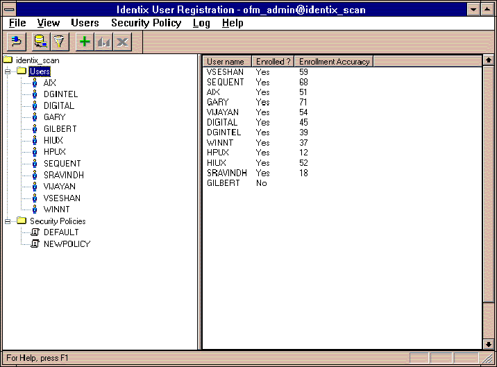 Figure 6-7 Identix User Registration Window with Expanded Object Tree