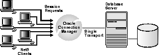 Oracle Connection Manager enables you to take advantage of Net8's ability to multiplex or funnel multiple logical client sessions through a single transport connection to a multi-threaded server destination. This is accomplished through Oracle Connection Manager's connection concentration feature.
