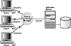 Figure 7-2 depicts how a client in an SPX/IPX network can route its session to a server over a TCP/IP transport through Oracle Connection Manager.