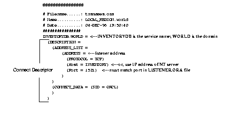 INVENTORYDB.WORLD = (DESCRIPTION = (ADDRESS_LIST = (ADDRESS = (PROTOCOL = NMP) (Server = NT_INVENTORY_BOX) (Pipe = ORAPIPE) ) ) (CONNECT_DATA = (SID = ORCL) ) )