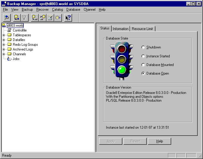the Backup, Recover, Catalog, Database, and Channel menus. For information