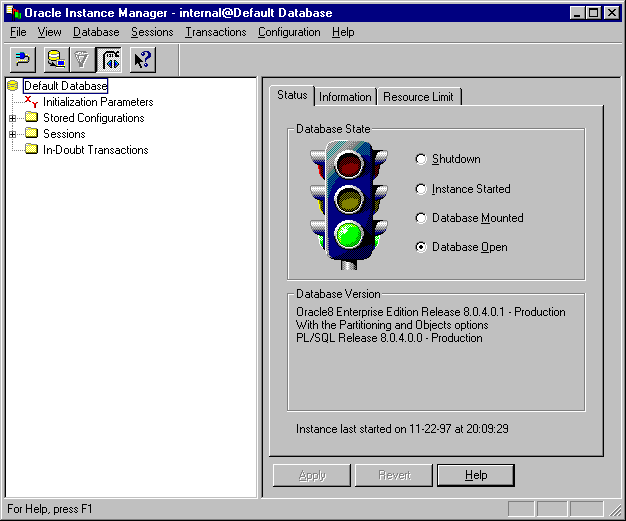 The Database menu provides access to all options pertaining to Oracle instance startup and shutdown.
