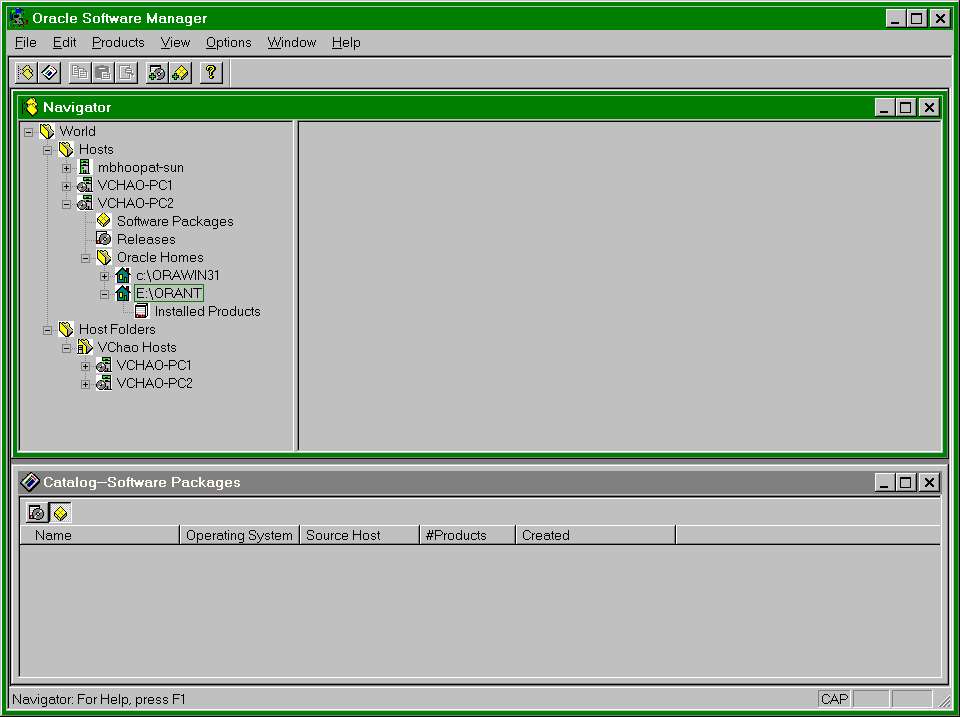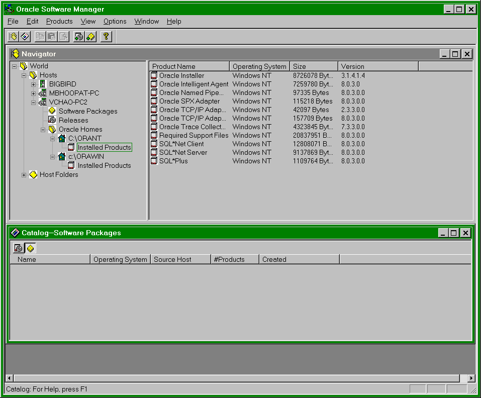 When Oracle Software Manager is started for the first time in a session, the Catalog window shows Releases. Use the two icons at the top of the Catalog window to display either the Releases view or the Software Packages view.