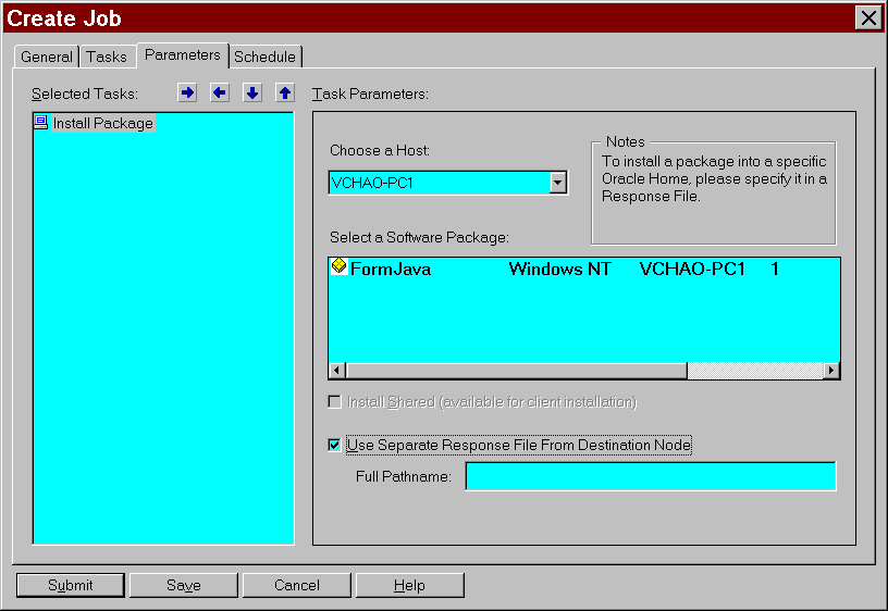 Using Oracle Software Manager, select products from releases on a distribution host and create a software package that can be installed over the network. Note: If a product needs a custom installation, you must modify the package response file before distribution and/or installation. You can view the status of the package creation under the current jobs window in Oracle Enterprise Manager. The list of created packages is in the Oracle Software Manager Catalog window. Package properties have the list of products it contains. Refer to "Response File Generator" on page 15-37 for instructions. |