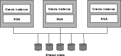 Oracle Parallel Server allows separate Oracle instances to run on different nodes. These instances operate against a common database which resides on shared disks physically accessible by all nodes that make up the cluster. The application database files reside on shared disks. Oracle8 environment files reside on local disks on a node. Each node has an Oracle8 server instance running and simultaneously accesses application data files on shared disks.