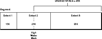 Figure 11-2 shows a segment which consists of three extents containing 10K, 20K, and 30K of space, respectively. The high water mark is in the middle of the second extent, thus the segment contains 20K of used space (to the left of the high water mark), and 40K of unused space (to the right of the high water mark.