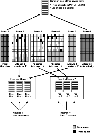 New extents that are automatically allocated to a table add their blocks to the master free list. This can eventually result in contention for free space among multiple instances on a parallel server because the free space contained in automatically allocated extents cannot be reallocated to any group of free lists. You can have more control over free space if you specifically allocate extents to instances; in this way you can minimize contention for free space.