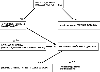 Note: Using the statement ALTER SESSION INSTANCE_NUMBER you can alter the instance number to be larger than the value of MAXINSTANCES. The figure shows how this possibility is taken into account: for the purposes of the internal calculation whereby free list groups are assigned, the instance number is brought back within the boundaries of MAXINSTANCES.