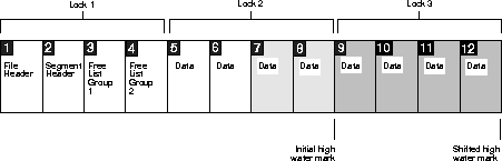 Consider the following example, in which there are 4 blocks per lock (!4). Locks have been allocated before the block content has been entered. If we have filled datablock D2, held by Lock 2, and then allocate another range of 4 blocks, only the number of blocks which fits within the lock boundary will actually be allocated: in this case, blocks 7 and 8. Both of these are protected by your current lock. With the high water mark at 8, when instance 2 allocates a range of blocks, all four blocks 9 to 12 are allocated, covered by lock 3. The next time instance 1 allocates blocks it will get blocks 13 to 16, covered by lock 4.