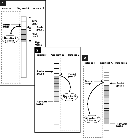 Using this method, you can either explicitly allocate the !blocks value, or else leave the balance of new blocks still covered by the existing PCM lock. If you choose the latter, remember that there still may be contention for the existing PCM lock by allocation to other instances. If the PCM lock covers multiple groups of blocks, there may still be unnecessary forced reads and writes of all the blocks covered by the lock.