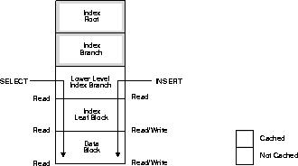 For example, Figure 13-1 illustrates read and write access to data in a large table in which two levels of the index are not in the buffer cache and only a high level index is cached in the SGA.
