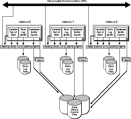 Note: The redo logs must be accessible to all instances in case of instance failure. On some MPP platforms, a redo server exists so that only one set of redo logs is necessary for the whole OPS system.