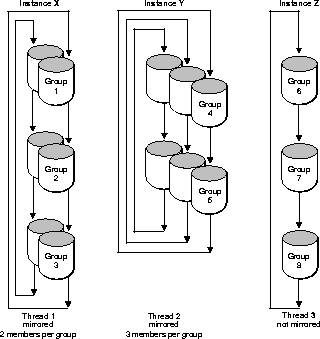 Different instances of a parallel server can have different degrees of mirroring (different numbers of members per group), and can also have different numbers of groups. For example, one instance could have three groups with two members per group, a second instance could have four log files that are not multiplexed, and a third instance could have two groups with four members per group. While such a configuration may be inconvenient to administer, it may be necessary in order to realize the full potential of the system.