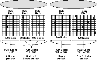 2, and two or three data blocks in datafile 3. Thus, one PCM lock may cover