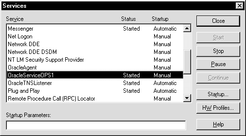 Prior to starting a OracleServiceSID service, the OraclePGMSService service must be running. If you used the CRTSRV script in "Step 4: Create Services", OraclePGMSService automatically starts up when the OracleServiceSID service is started.