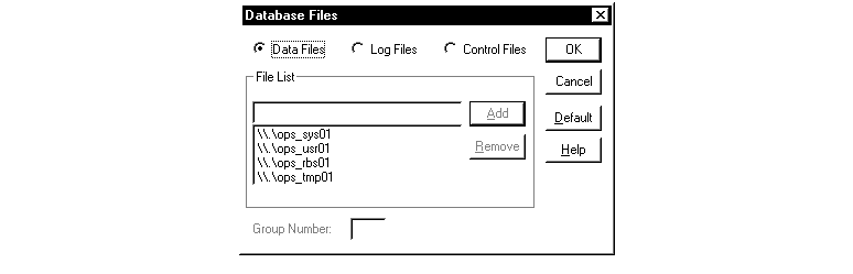 The Database Files dialog box appears. Select each file type (Data Files, Log Files and Control Files), and enter the appropriate file name. File names should match the symbolic link names you used in the ORALINKx.TBL file(s):