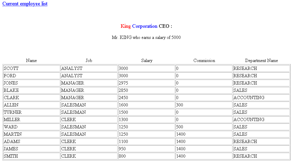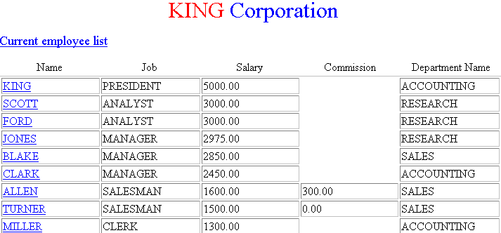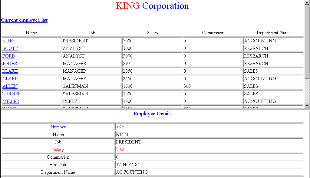 Note that when you pass the mouse pointer over the employee name, an HTML file is linked to the name. The file each employee name points to is what you will be creating in the next section, such as EMP#HTM, where EMP# is the employee number. After you complete the next section, the result will be a file EXAMPLE3.HTM which incorporates the files MAIN.HTM and EMP#.HTM.