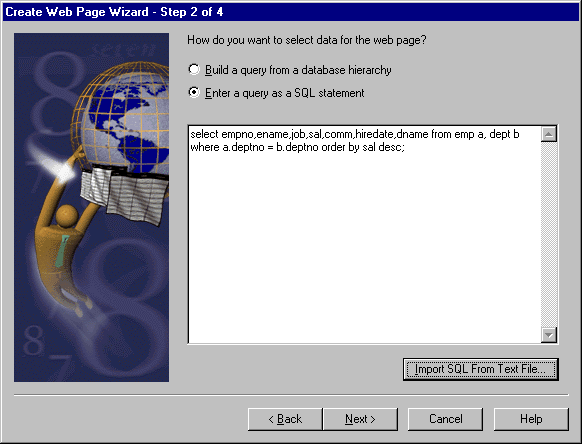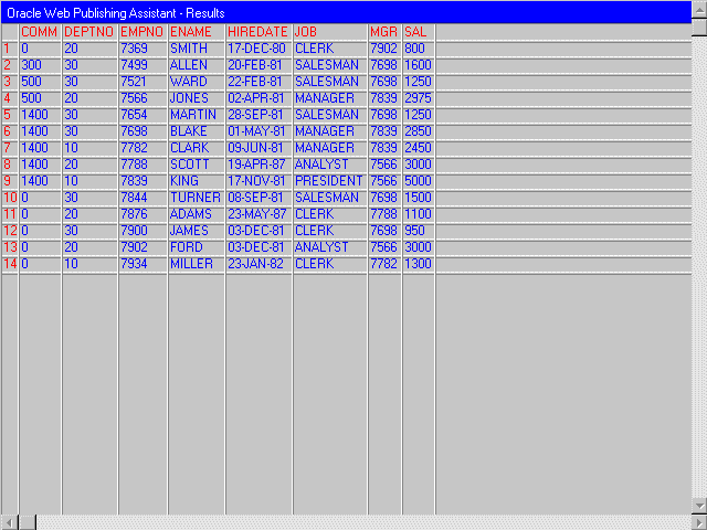 The second tutorial queries the SCOTT.EMP table (installed automatically when you install Oracle8 using the Typical Installation Option) and formats the retrieved information using the template EXAMPLE2.HTX.