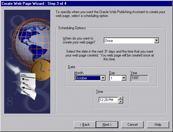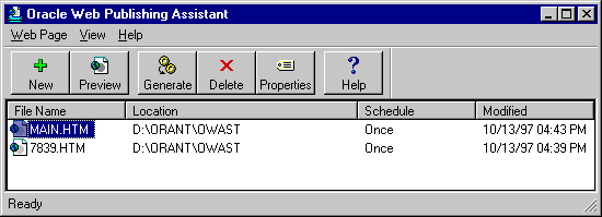 Oracle Web Publishing Assistant merges the results of the database query with the template. The result is a web page query. All of your scheduled web page queries are listed in the Oracle Web Publishing Assistant file listing.