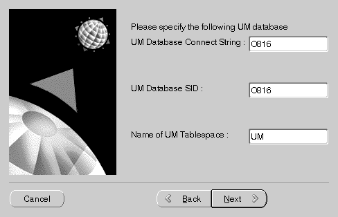 On this screen you must enter the Oracle SID and connect string for Unified Messaging, as well as the Unified Messaging tablespace name.