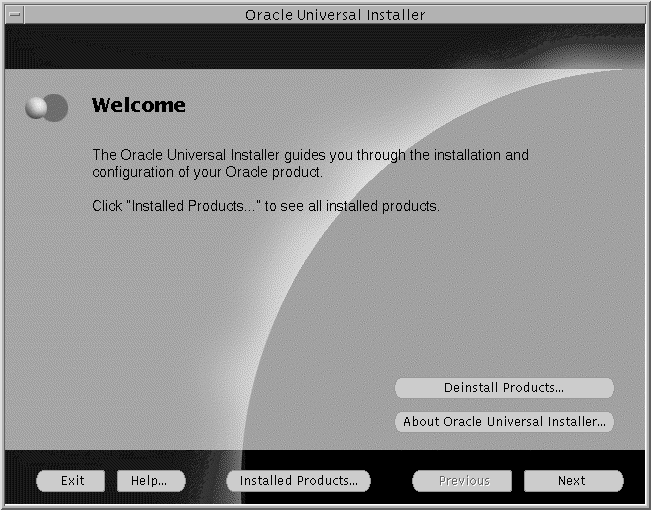 The ./runInstaller command launches the Oracle Universal Installer and the Welcome dialog box displays.