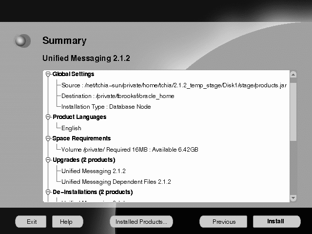 The Summary screen enables you to verify your installation settings. These settings include the source and destinations locations you specified; the installation type you selected; the product language; the space requirement for installation and the space currently available; and the Unified Messaging products that will be installed.