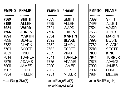 The following figure shows the effects of some of these methods. In the view at left, the range size is set to 5 (setRangeSize(5)), so the range contains the first 5 rows of the result set. Next, in the middle view, the start of the range is at row 4 (range start is 0-based, thus setRangeStart(3)) of the result set and the range size is set to 3, so the range contains rows 4 through 6 of the result set. Finally, in the view at right, the range window is scrolled forward 4 rows. The range size does not change, so the range contains rows 8 through 10 of the result set.