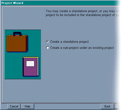 In the Project Wizard, you can choose to create a standalone project (the default), or create a subproject, a project that's part of a larger project. We'll create a standalone project.