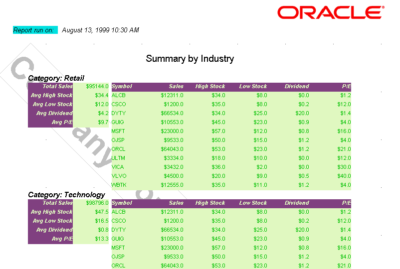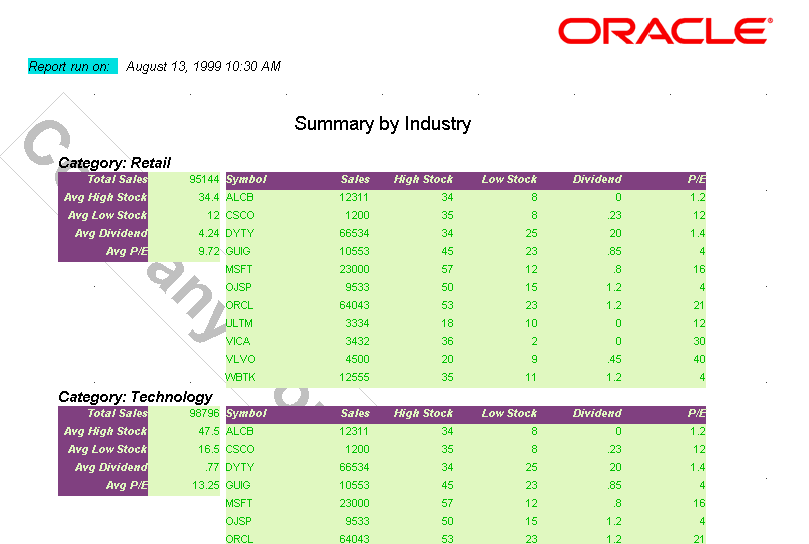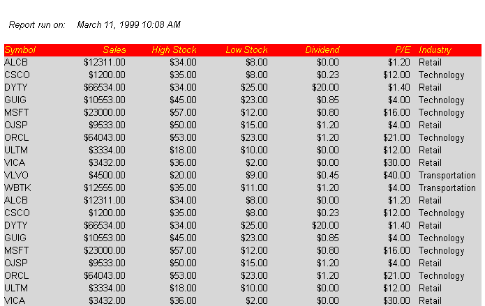 In this report example, you will build a multi-query report that summarizes stock information by company symbol using the Tabular report style. You will create a new template and apply the template to the report. Then you will enhance the template by changing several default attributes in the template margin and body. You will enhance the template further by overriding some of the default attributes of the Group Above style. Finally, you will create an additional layout using the Group Above style, and re-apply the template to the report.