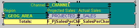 Notice the projected and actual sales. In the new report, each cell represents the yearly sales for a region and channel in a product division for 1997, while the previous report displays sales data for a region and channel in a product division for each month.