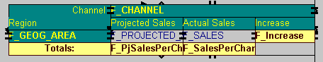 To understand why this error occurred, look for F_INCREASE in the Object Navigator. It is probably placed at a higher level (and lower frequency) than R_G_PROJECTED_SALES. Recall that the column INCREASE calculates the percent of actual sales above projected sales. In order to run this report, F_INCREASE must have the same frequency as F_PROJECTED_SALES and F_SALES to reference the data it needs to calculate the value.