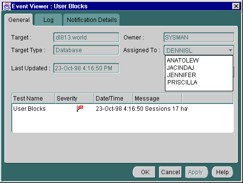 reassign the alert. Enterprise Manager then notifies the assignee via e-mail, pager, or both. |